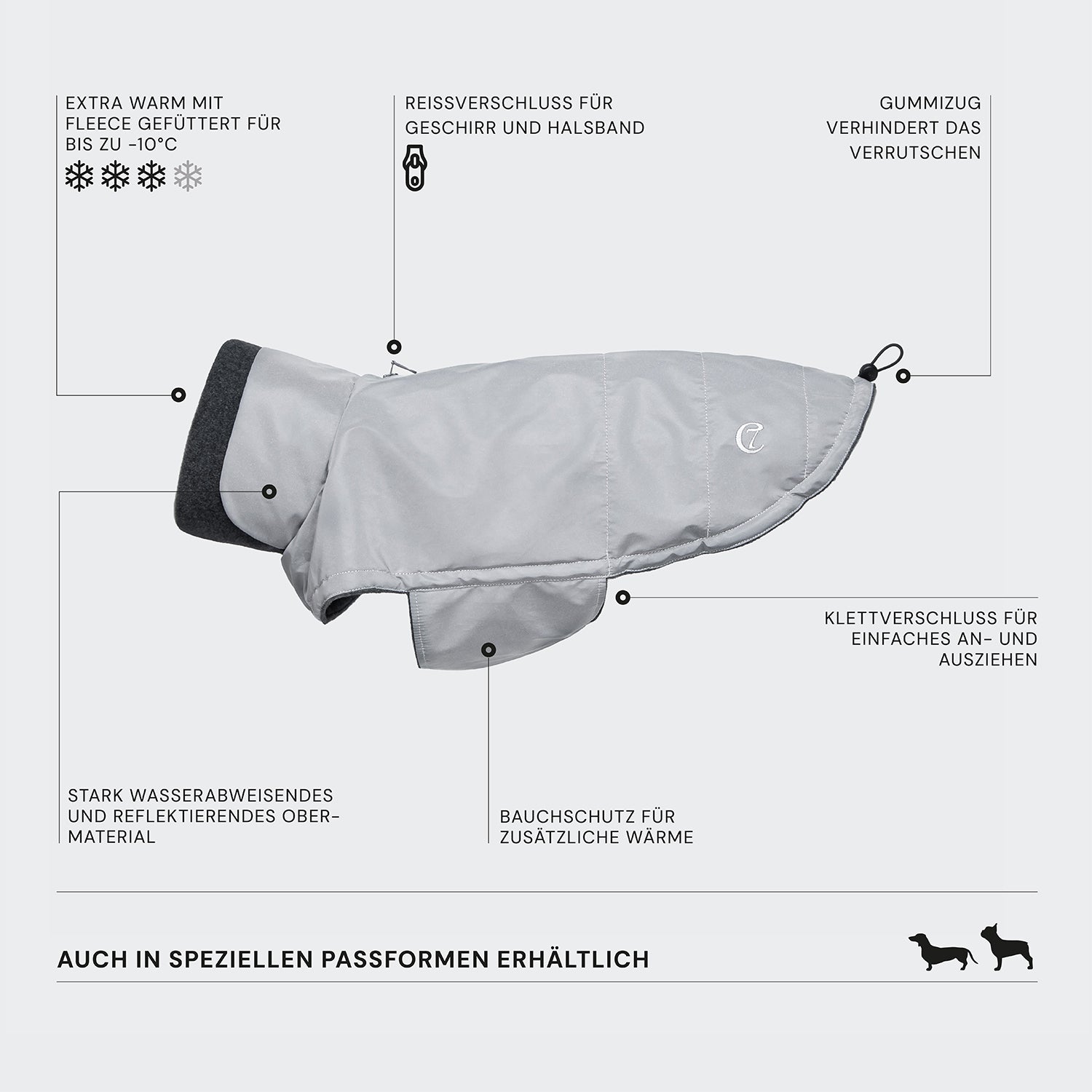 Ein Hundemantel für französische Bulldoggen mit bequemer Passform, warm mit Fleece gefüttert und vollendet mit einem stark wasserabweisenden, komplett reflektierenden Stoff.