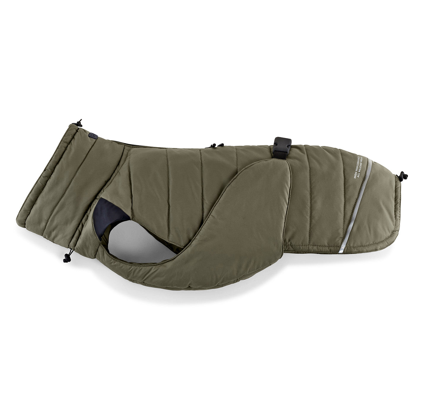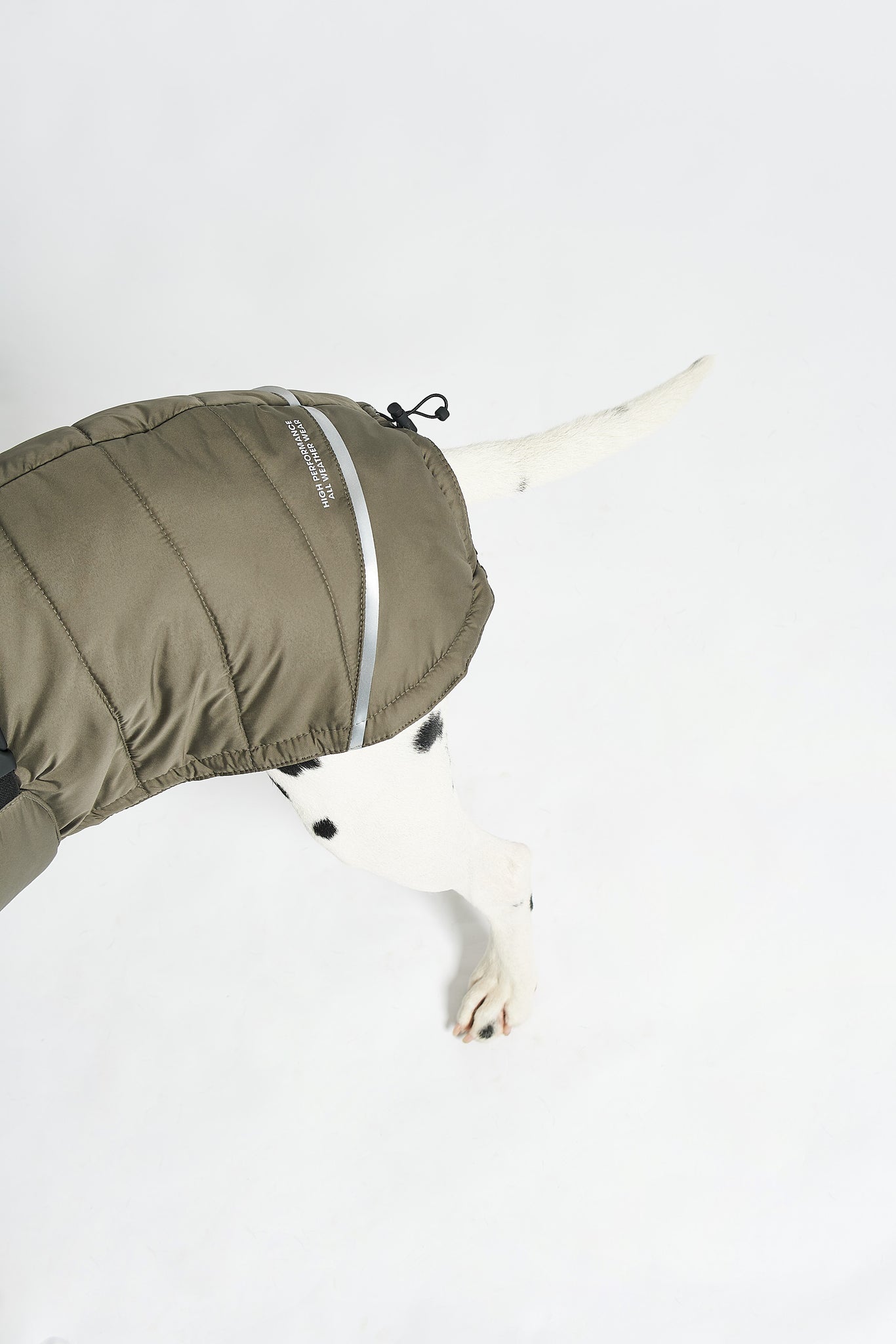 Der Mantel überzeugt besonders durch seine Materialien: Der Oberstoff besteht aus recyceltem Polyester und ist wasserfest. Die spezielle Füllung des Mantels ist wärmer und funktionaler als Daunen und schützt Ihren Hund auch bei eisigen Temperaturen zuverlässig vor dem Auskühlen.