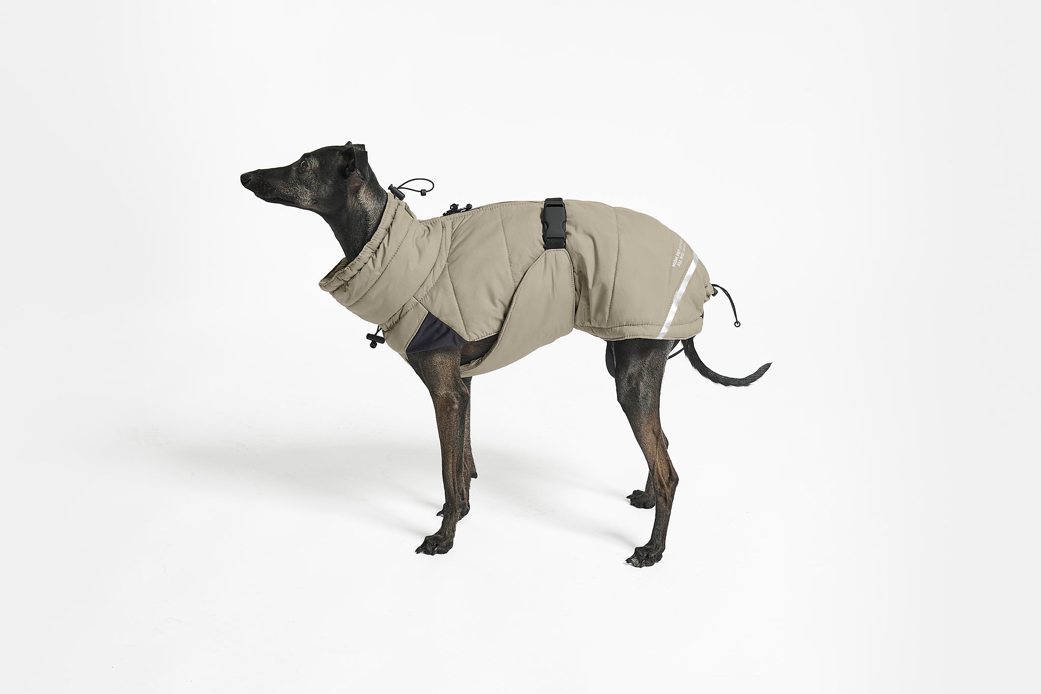 Der Mantel überzeugt besonders durch seine Materialien: Der Oberstoff besteht aus recyceltem Polyester und ist wasserfest. Die spezielle Füllung des Mantels ist wärmer und funktionaler als Daunen und schützt Deinen Hund auch bei eisigen Temperaturen zuverlässig vor dem Auskühlen.